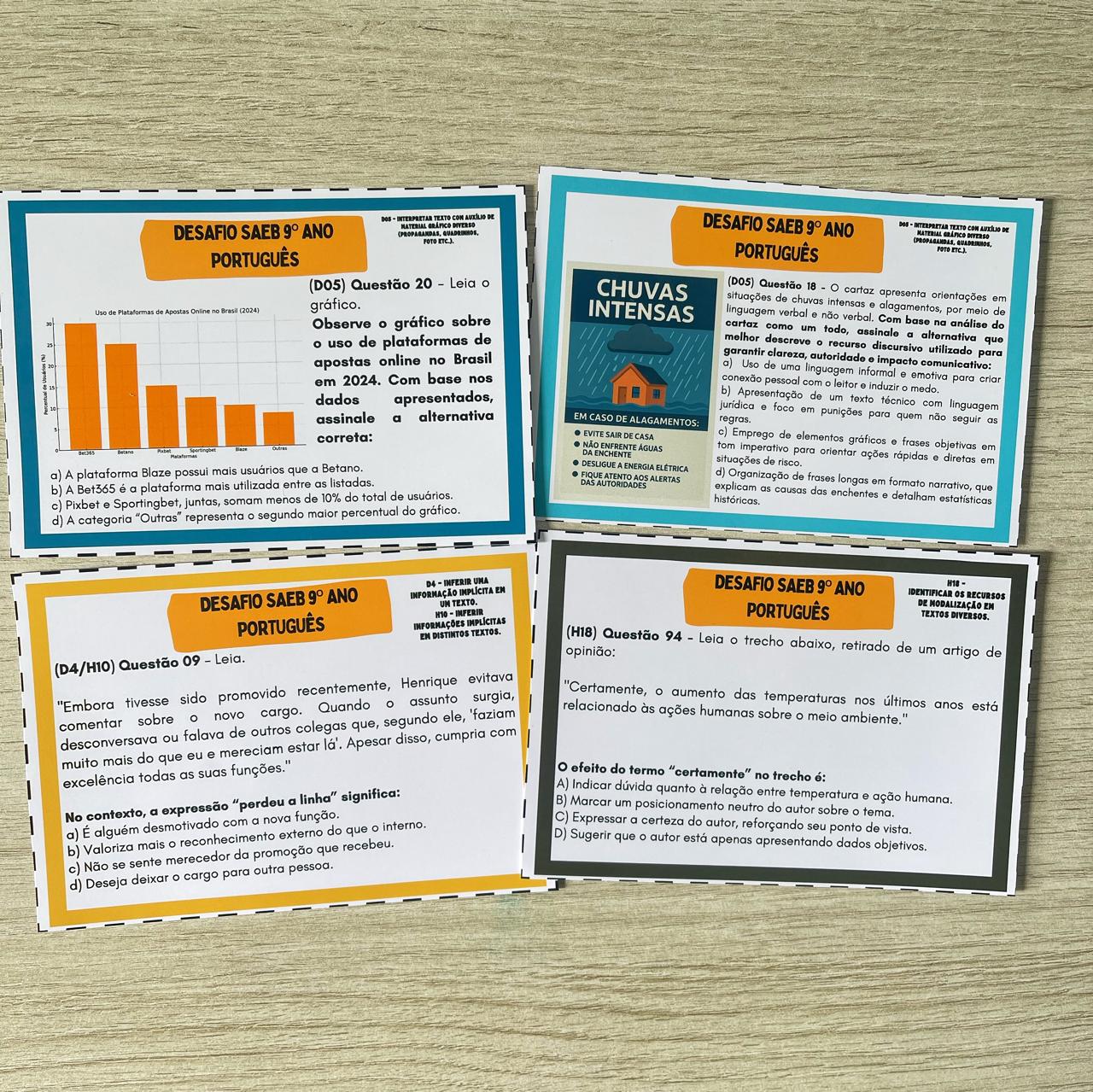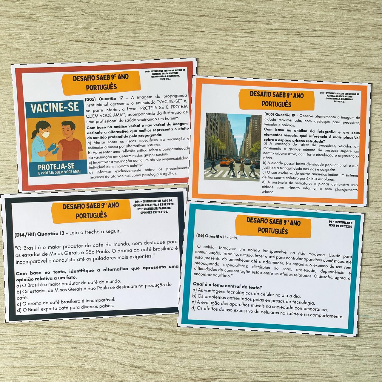 O Desafio SAEB é um jogo pedagógico com 102 cartas, gabarito completo e uma caixa personalizada, criado especialmente para preparar os alunos do 9º ano do Ensino Fundamental para as habilidades exigidas pelas avaliações externas do SAEB (Sistema de Avaliação da Educação Básica).