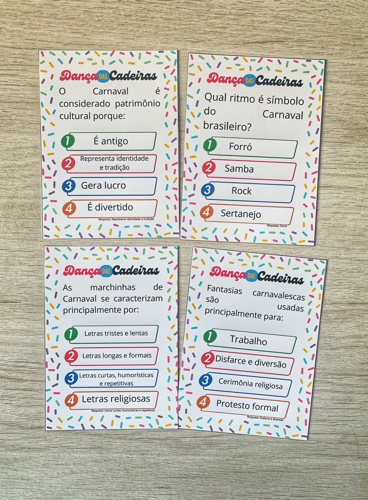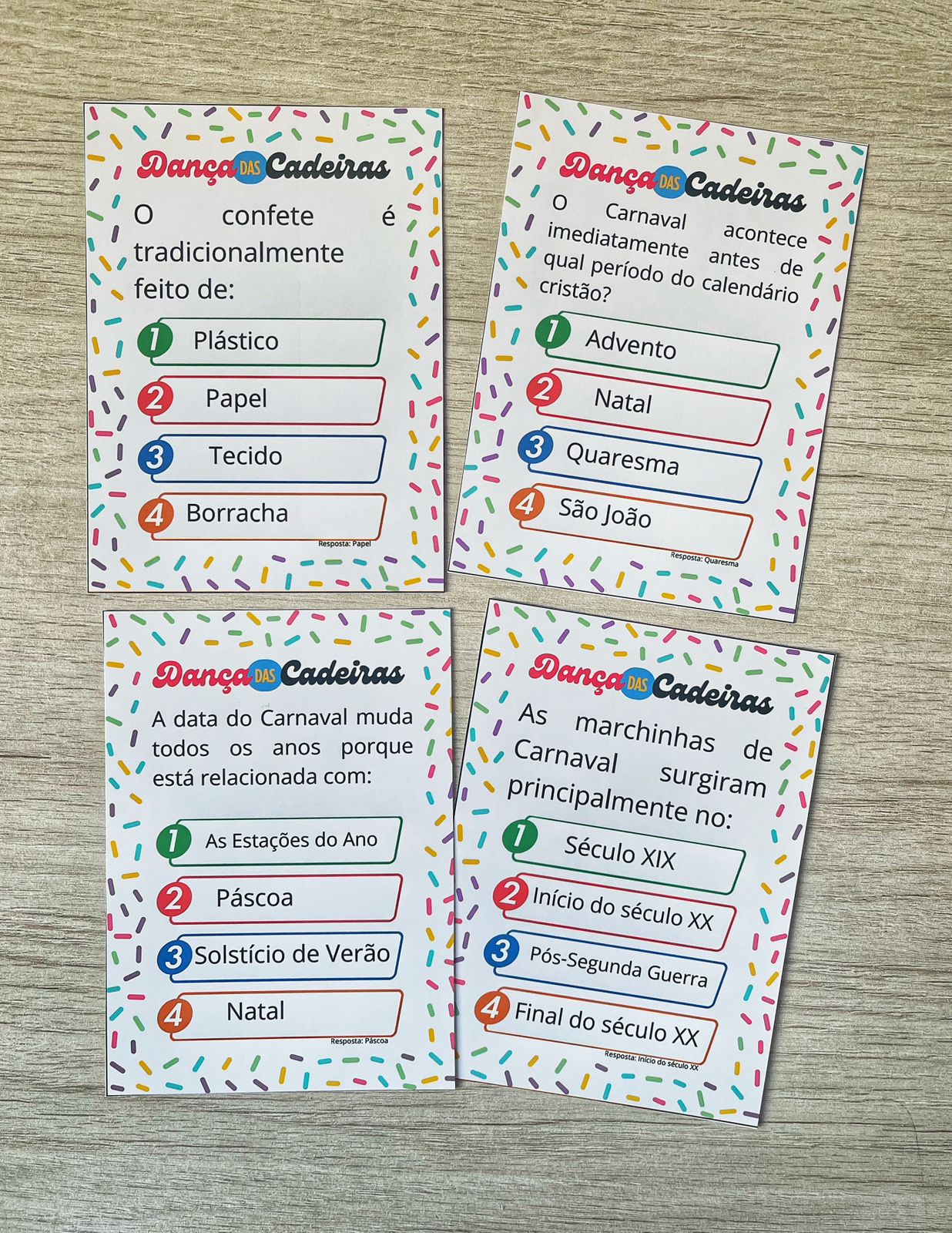 Cada carta traz uma pergunta com 4 alternativas, prontas para imprimir e usar.